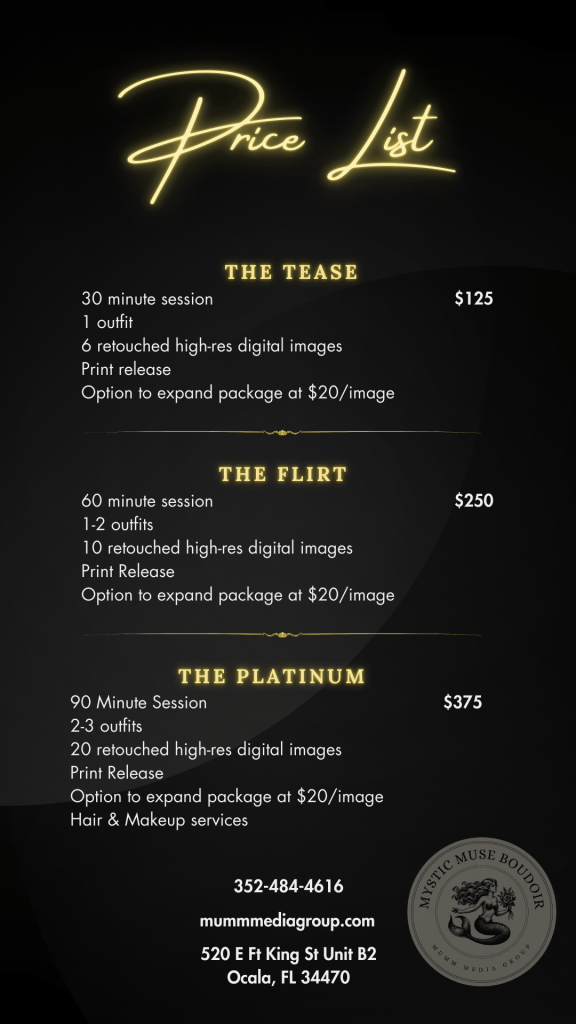 At Mystic Muse Boudoir, we specialize in creating empowering, inclusive, and body-positive boudoir photography experiences. Our goal is to help you see yourself in a new light, embrace your confidence, and celebrate your unique beauty. Whether this is your first session or you’re a boudoir veteran, we strive to make you feel comfortable, confident, and radiant.
